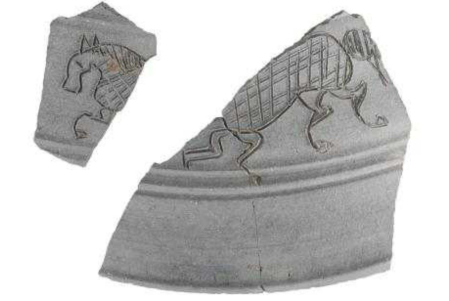 이와 별도로, 말 문양은 발형기대(그릇 받침대)의 다리 부분으로 추정되는 토기 조각 2점에서 확인되었다. 말이 새겨진 문양은 총 2개체로, 말 갈기, 발굽, 관절 뿐 아니라 갑옷을 입은 모습까지 비교적 상세하게 묘사되었다. 현재까지 발견된 토기에 새겨진 말 문양 중 회화 표현이 가장 우수한 사례로 보고 있다.
