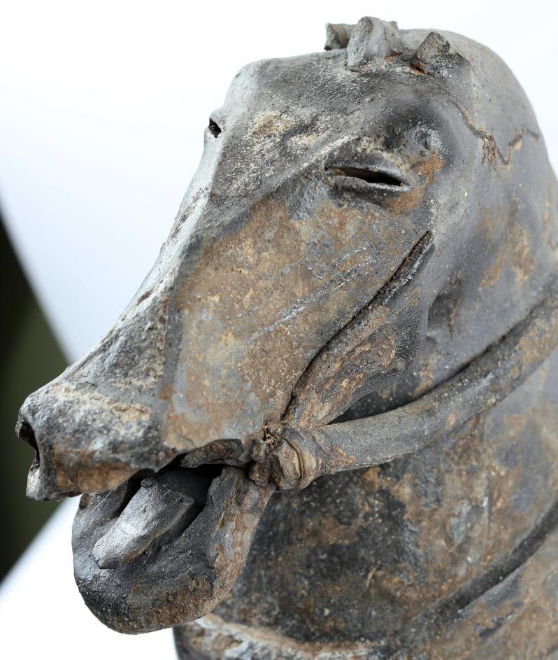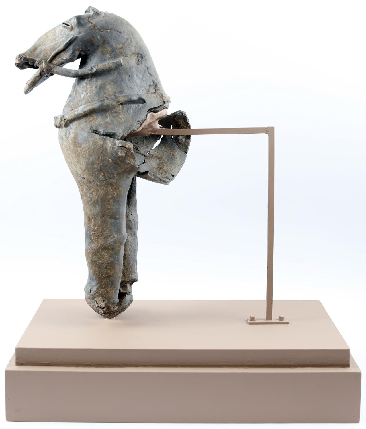 말모양 토기는 높이 56㎝로 지금까지 확인된 것 중 가장 크며, 일제강점기에 수습된 국보 제91호 기마인물형토기와 제작 기법이 거의 동일하다. 다만, 입을 벌리고 혀를 내밀고 있는 모습이나 얼굴과 턱·목·발굽 등 각 부위를 정밀하게 표현한 점, 실제 말의 비율에 가깝게 제작된 점 등은 차이를 보인다. 현재는 머리와 앞다리 쪽만 확인되었는데, 등과 배 부분이 깔끔하게 절단된 듯 한 흔적이 보여 의도적으로 깨뜨려 넣은 것으로 추정된다.
