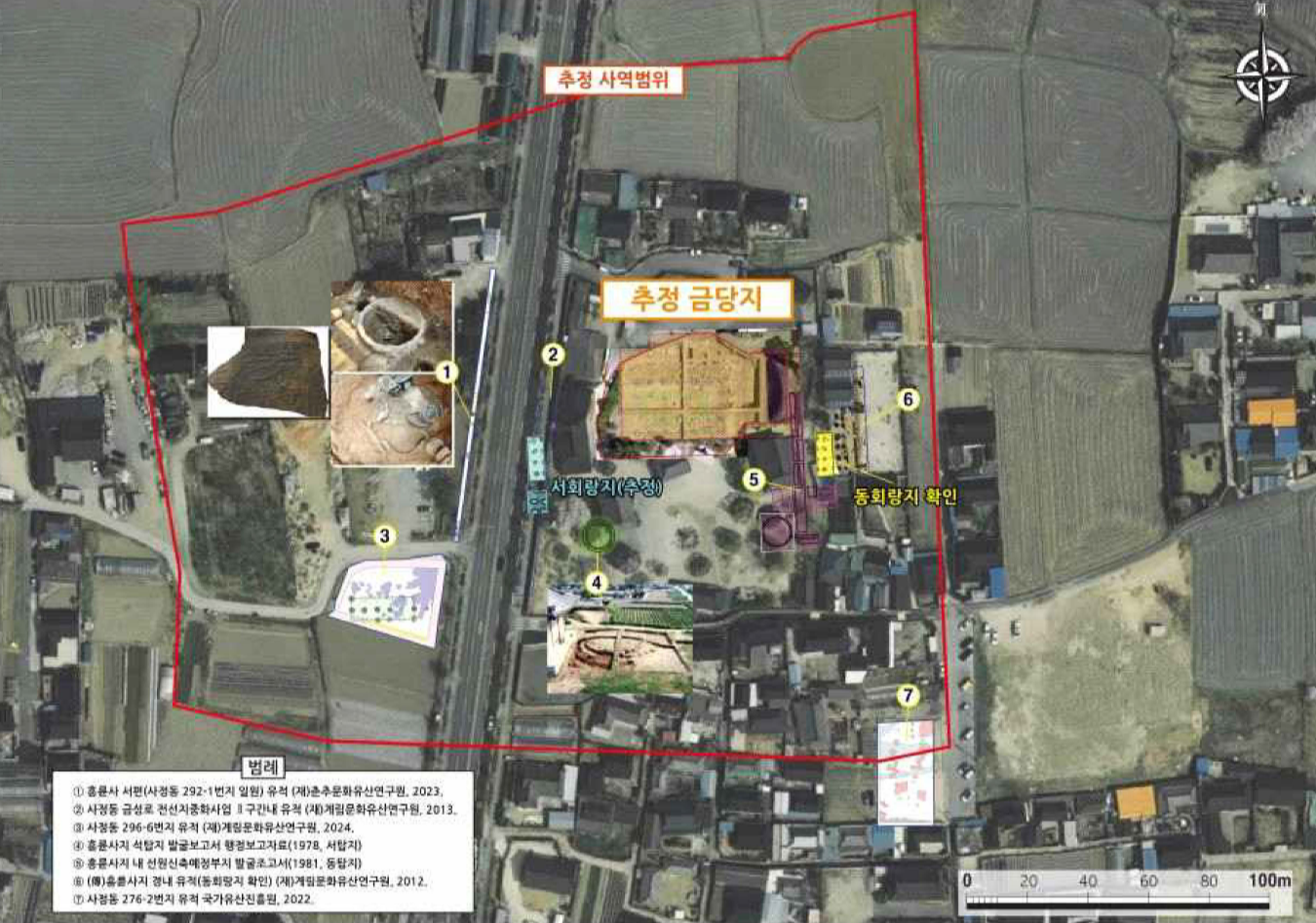 | * 발굴현장: 경상북도 경주시 사정동 285-6번지 * 금당: 사찰 중앙에 위치한 중심건물로 본존불을 모신 큰 법당 * 기단: 건축물을 받치기 위해 흙, 돌 등으로 높게 쌓은 단(시설) * 차양칸: 햇볕을 가리거나 빗물을 막기 위해 출입부나 통로의 상부 벽이나 지붕 끝에 내밀어 만든 지붕 |